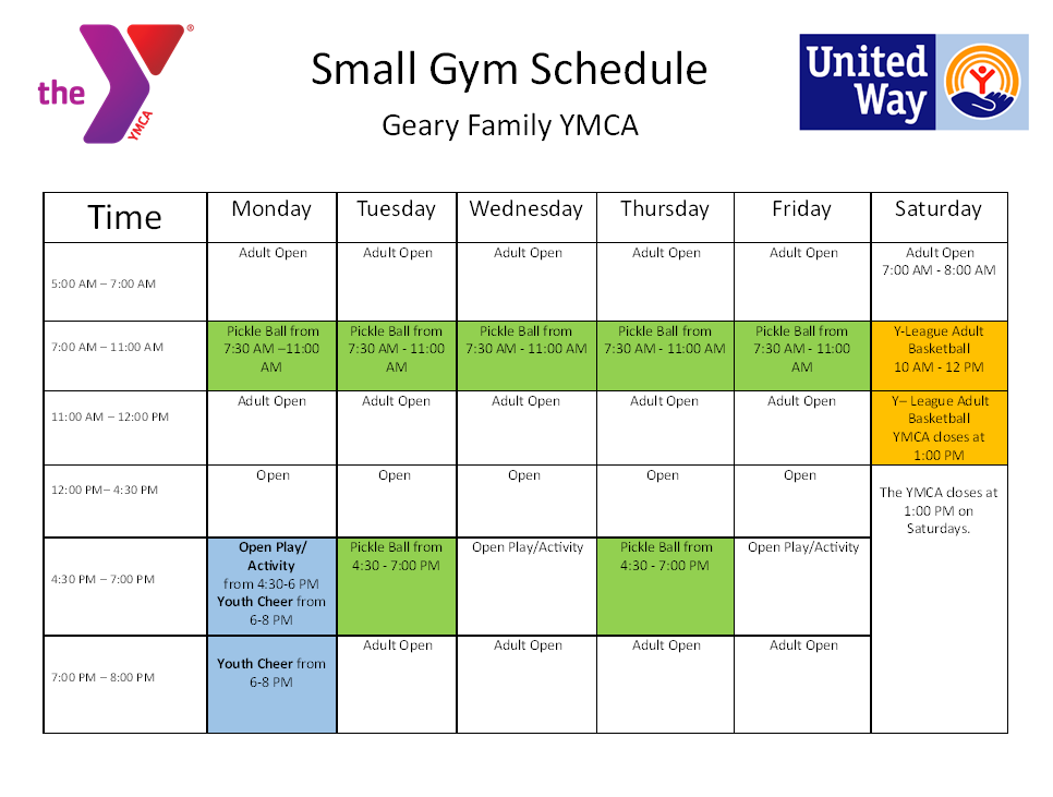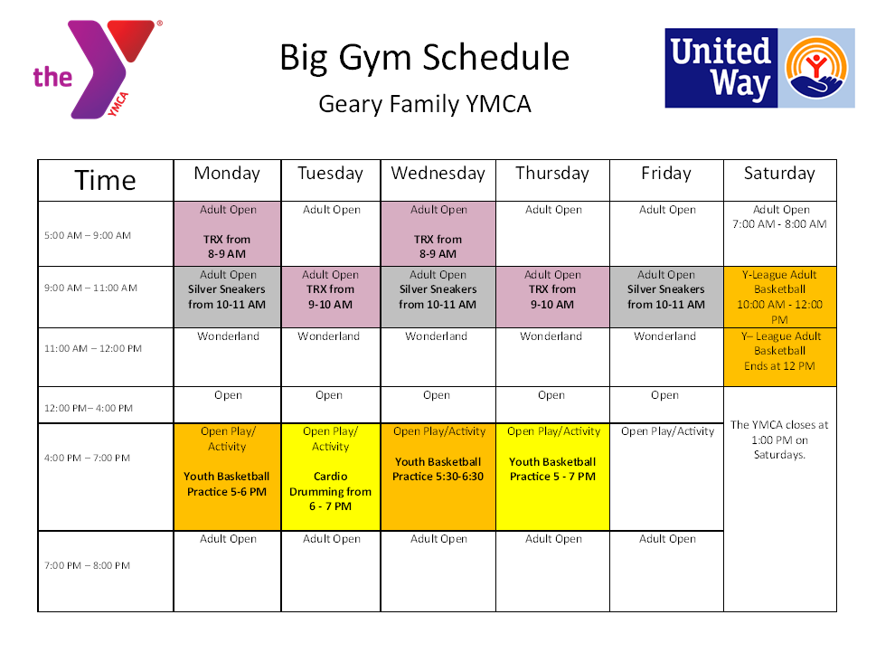 Wednesday Adult Basketball will start at 5:30 PM in the Big Gym. The adults, 18+, will have first choice of the big court during that time. The Small Gym will be available for use.